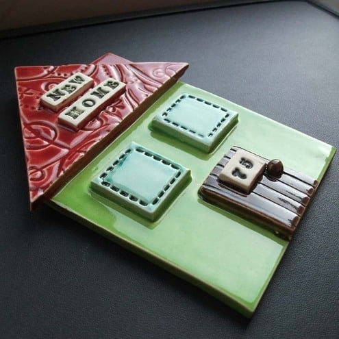 The plaque is hand cut from white earthenware clay, embossed and pieced together. It is twice fired to a top temperature of 1100 degrees so it is nice and strong.