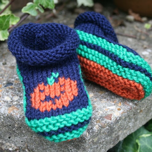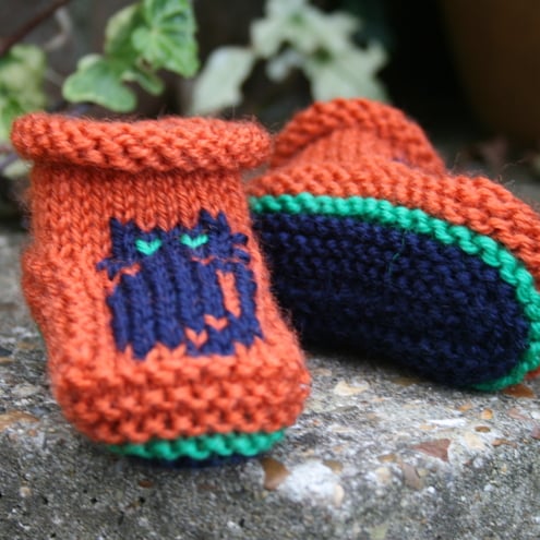 This is a detailed written knitting pattern in pdf format for baby's booties. These cute booties would look great for Halloween and the autumn. They knit up quickly in just a couple of evenings!