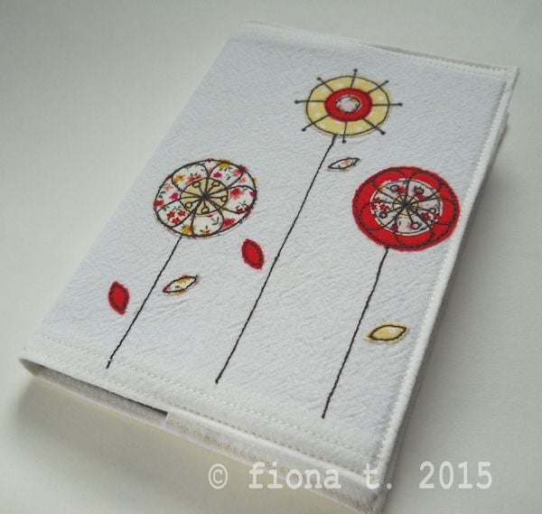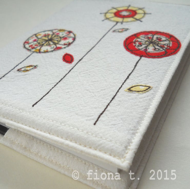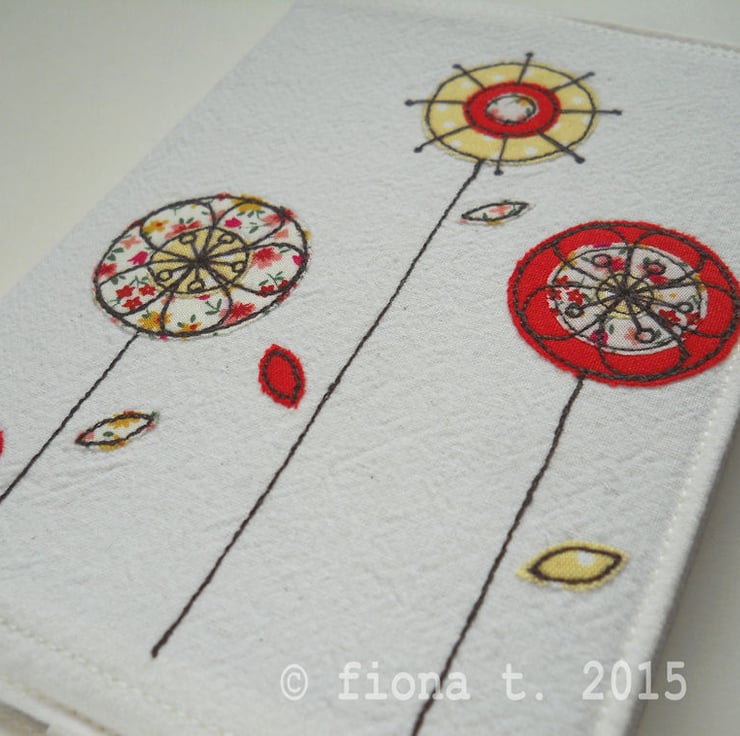 embroidered fabric notebook cover with a contemporary stylised floral design in red and yellow.