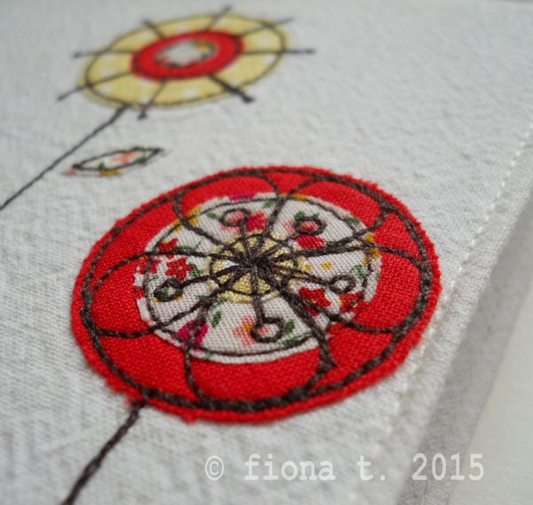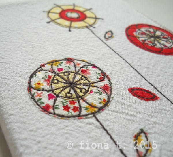 tiny floral print and cotton fabrics are layered and appliqued onto cotton calico, and the intricate details drawn on with free machine (free motion) embroidery.