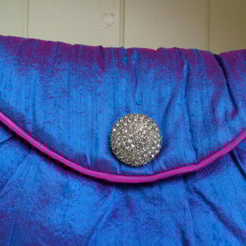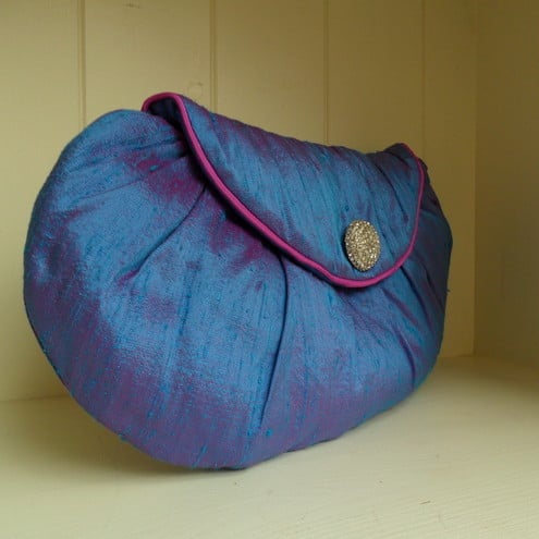 This lovely under arm clutch is made in a gorgeous blue silk dupion, with cerise piping and lining. Inside there are two pockets and it closes with a magnetic snap. The bag is finished off with a stunning diamante button. There is also a 50cm chain which can be tucked inside when not in use.