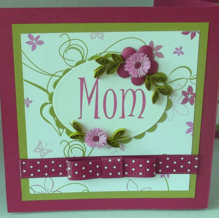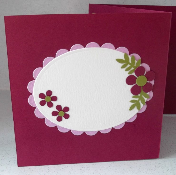 A beautiful, unique card featuring paper quilling. This card has three panels - each panel measures 5" x 5" approx. The front panel is decorated with quilling flowers and foliage, the other panels are adorned with punched flowers, all in pretty shades of plum, lilac and olive green.