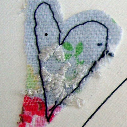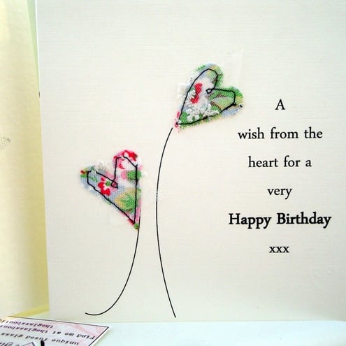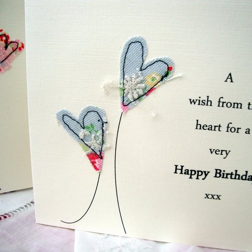 a lovely handmade card with two little fabric hearts to say happy birthday,