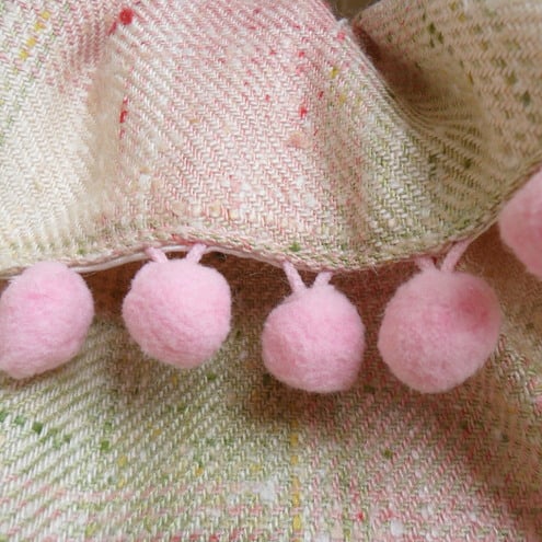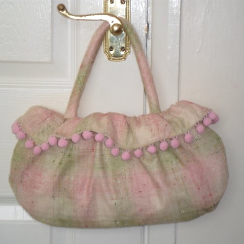 Made from a lovely pink and green lightweight suiting, with a decorative frill edged with a pom pom trim. This bag has two handles and closes with a magnetic snap.