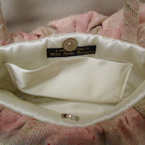 It is lined in ivory satin and has a slip pocket and a zipped pocket.