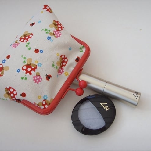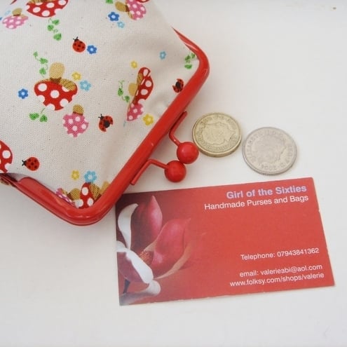 Perfect little purse for your keys, change and credit cards. Pretty mushroom fabric with contrasting lining, padding and red frame clasp.
