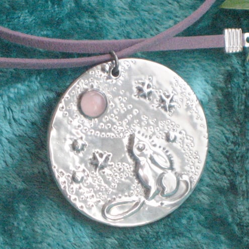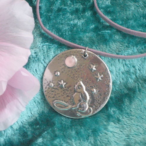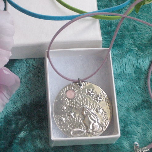 This lovely pendant features the legendary hare gazing up at a moon of genuine rose quartz. Measuring 38mm(1.5")across, it has been handmade in modern lead-free pewter, and comes on a choice of laces:- round fabric in black, or flat suede effect in mauve, blue or green. If you do not express a preference, I will send the mauve. Gift boxed.