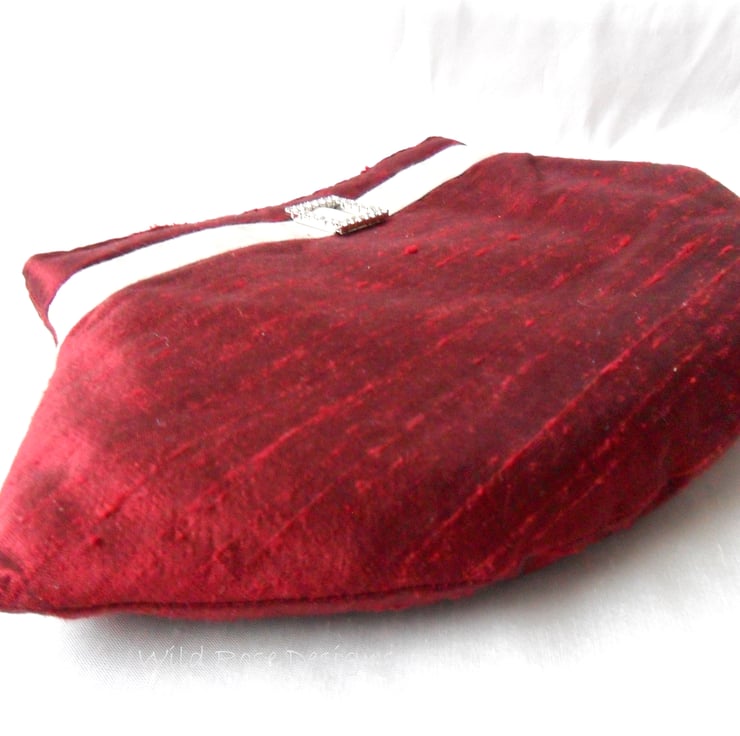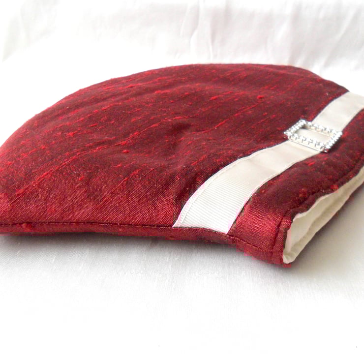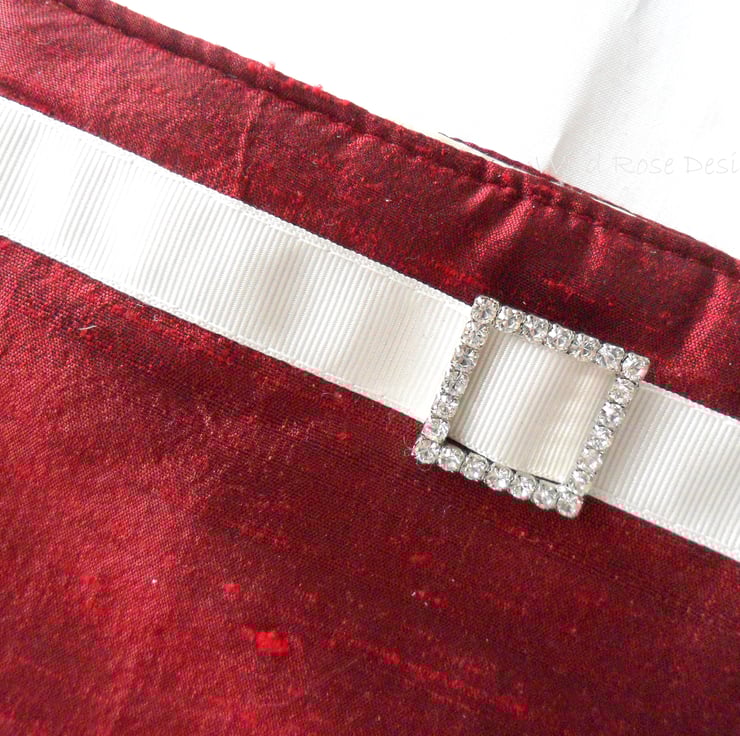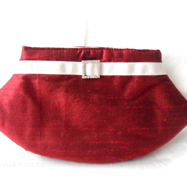 This lovely clutch is made from a ruby coloured silk dupion and is lined in ivory satin. The bag is trimmed with a gross grain ribbon and a diamante buckle. Inside there are two pockets, one for your phone/mirror and a small one that will take your lipstick, and it closes with a magnetic snap.