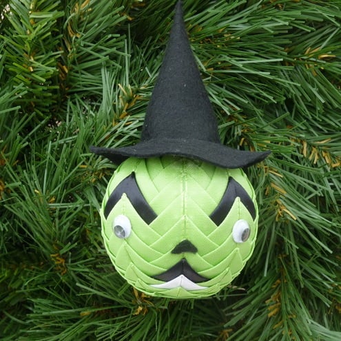 This Spooky,Green Witch will make a great decoration for any Halloween Party. It can be hung in a window to frighten those Trick or Treaters away or even hung from a hook on the wall. Its made from a polystyrene ball and Green and Black Ribbon with a felt hat and nose. It also has moveable goggly eyes.