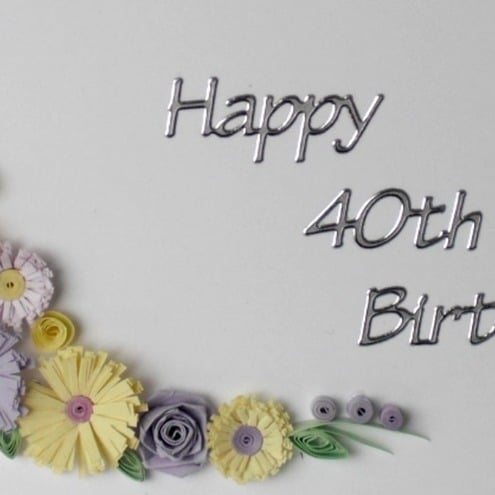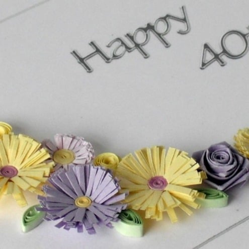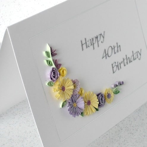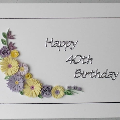 A beautiful quilled birthday card with quilling flowers in lovely coordinating colours of lilac and lemon. A distinctive handmade greetings card to celebrate a milestone birthday. The age can be changed on this card to suit any age birthday - just leave me a note as you order.