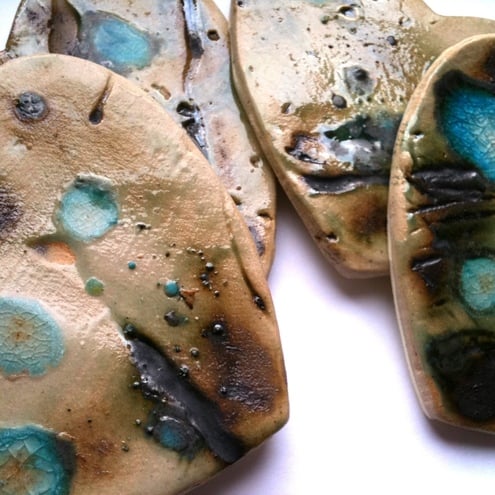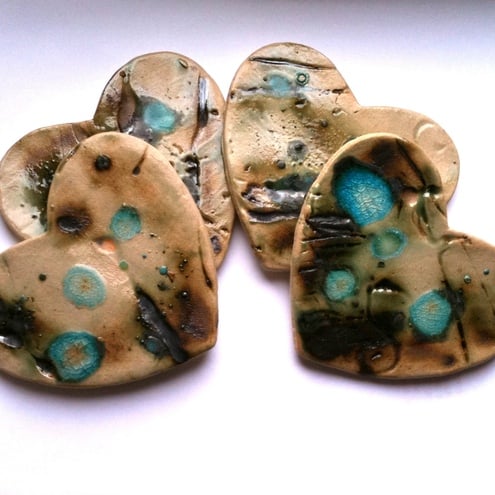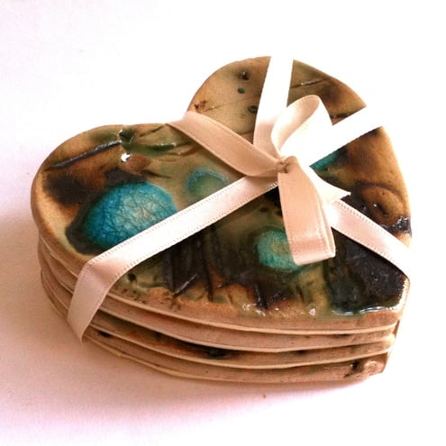 This set of 4 heart shaped handmade ceramic coasters are each individually decorated in a turquoise and copper design. Each coaster is approx 8cm in diameter, and has a piece of cream foam neatly attached to the underside. The foam prevents them from scratching the table/surface and stops them slipping around.
