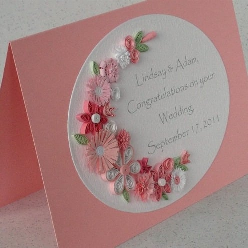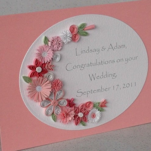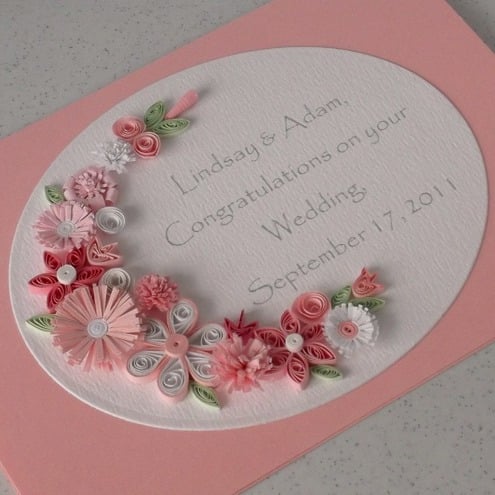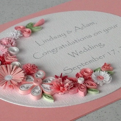 A beautiful quilled card with quilling flowers in pretty shades of pink and white, perfect for sending congratulations to the happy couple on their special day.