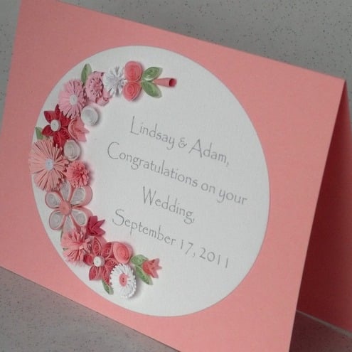 Wedding congratulations card with quilled flowers, personalised with names and date.