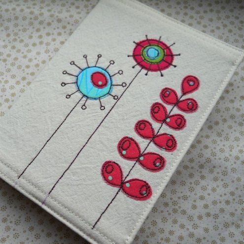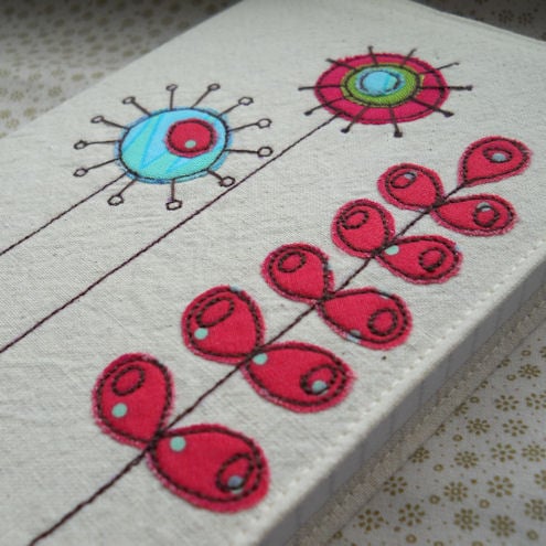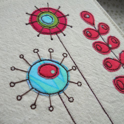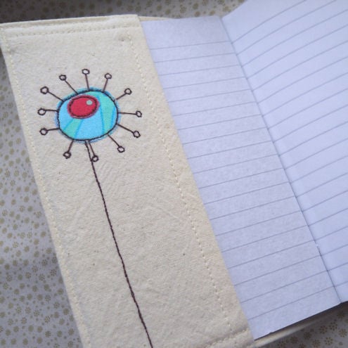 this notebook features a bright floral-inspired design on the front cover, and one flower on the inside flap, in bright pink and blue printed cottons. these are appliqued and layered onto pre-washed calico, and then "drawn" on with free machine / free motion embroidery.