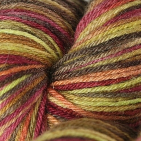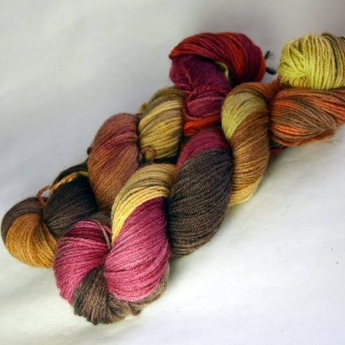 Soft and slightly lustrous DK weight British Bluefaced Leicester yarn in autumnal shades of brown, orange, soft lemon-yellow, dark pink and ochre. There is one skein left. It is the slightly more muted of the two (first photo and back of second photo). This yarn has been reskeined as shown in the first two photos but is shown before reskeining in the third photo, for reference only.