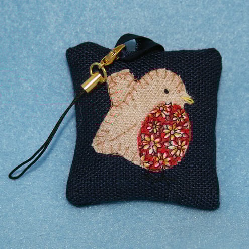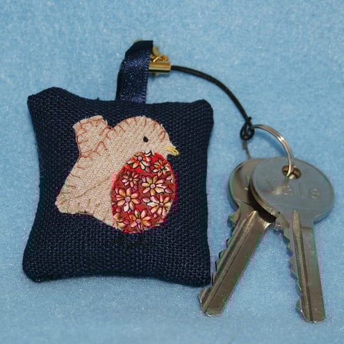 The robin is cut from pale brown wool and floral red fabrics (stabilised by iron on interfacing) and is hand appliqueed onto a navy blue linen-type fabric. A ribbon loop at the top of the fob is used to attach the lobster claw clasp of the charm lanyard (included). The fob is gently stuffed with polyester filling to which has been added a teaspoon of dried lavender. (Message me if you prefer a fob without lavender).