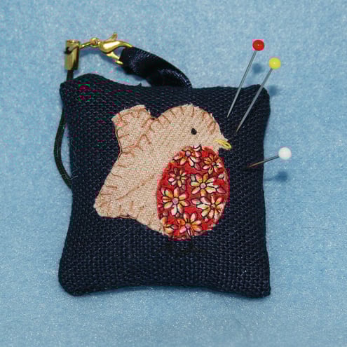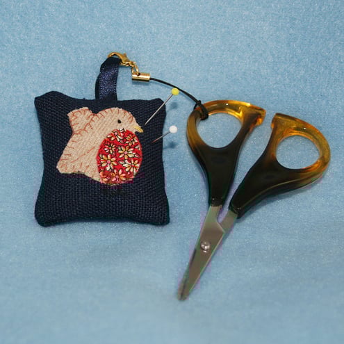 A chirpy little robin decorates this embroidered fob. It may be used as a charm, attached to your bag or keys, as a pincushion on its own or attached to your scissors. Filling includes fragrant lavender.