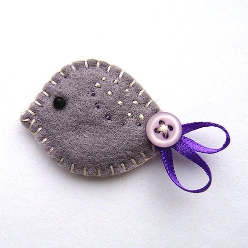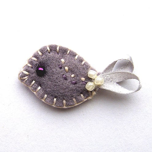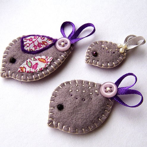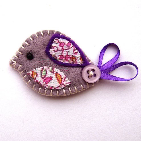 This is a cute set of little bird brooches. It includes a main bird in grey felt with appliqued wing and belly in pretty cotton print fabric. It is finished with a pretty ribbon tail and button detail.