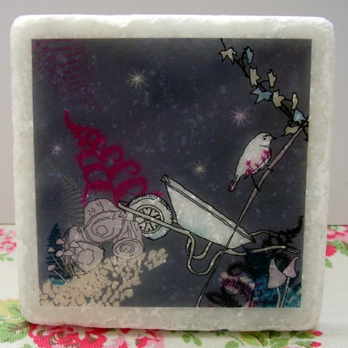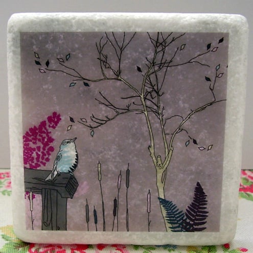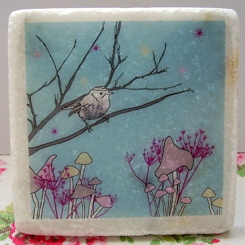 Each tile features my original artwork, inspired by my magical allotment and it's various flora and fauna. The design is created through a combination of hand drawn imagery, drawing directly on the computer screen and taking patterns and shapes from my own digital photographs. These elements are then layered and positioned until i am happy with them to make the finished design you can see on the product. My design is then printed onto a special decal paper which is carefully applied to a white marble tile. Each tile is varnished so can be safely wiped clean without harming the design. Each tile also has foam feet making them scratch resistant and a 'littlebirdy' sticker on the back.