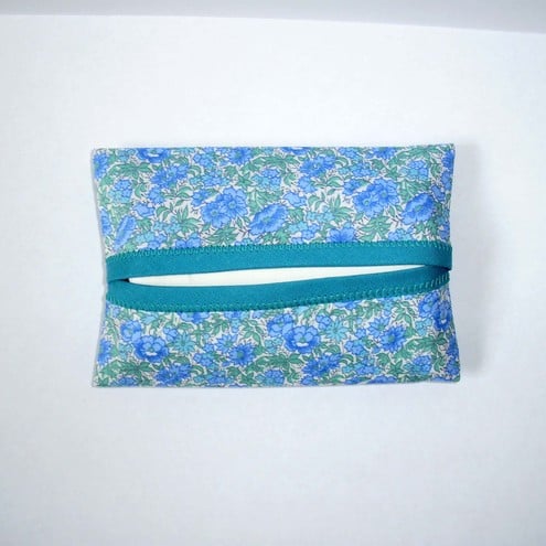 A handy holder for a pocket pack of tissues, ideal for the handbag. Made from a pretty vintage Liberty print fabric, the holder is lined for softness and strength, with toning green binding.
