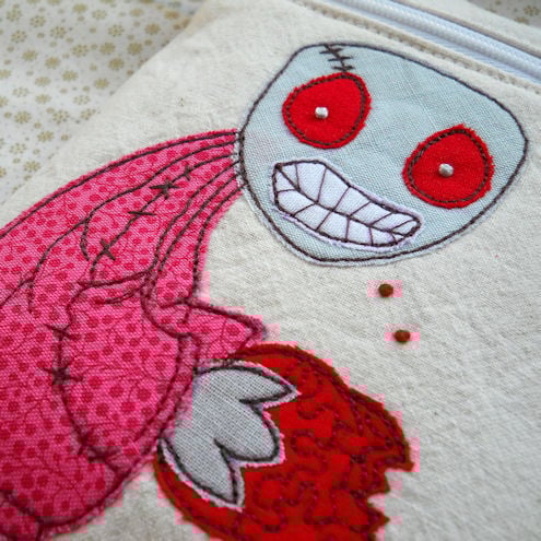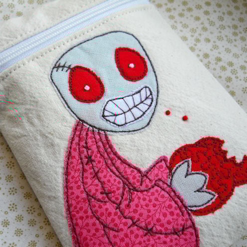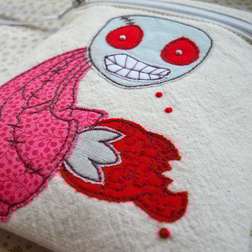 the zombie is in pink floral-printed fabric, munching on a bright red cotton brain. the fabrics are layered and appliqued onto pre-washed calico, before being "drawn" on with free machine embroidery. it also features hand embroidered eyeballs and blood.