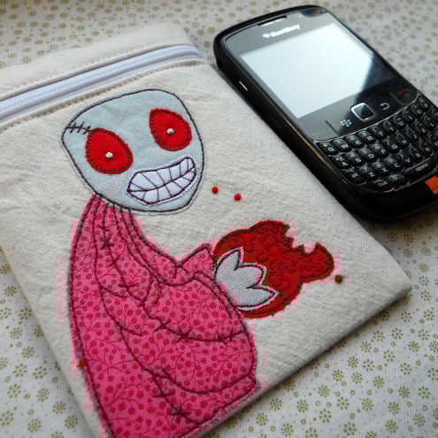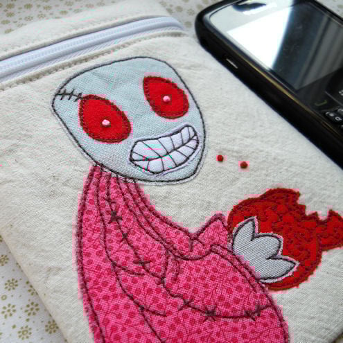 this appliqued and free motion embroidered gadget case is suitable for smart phones, cameras, ipods etc, but would be equally useful as a little purse to store the bits and bobs that get lost in the bottom of your handbag.
