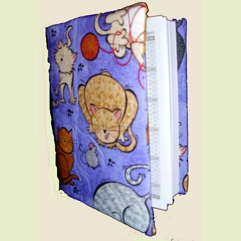 A6 diary cover. The cover is made from a cat printed fabric, which has been quilted to enhance the design... Complete with standard A6 day to a page diary, refills are easily available, for the next year.