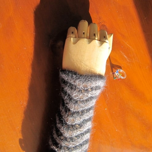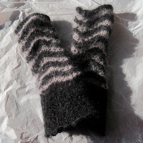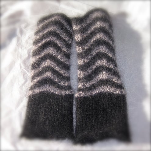 Delicate and ight as a feather but really warm these hand knitted silk/ kid mohair mix wristwarmers have a gentle ripple pattern.