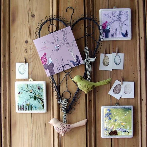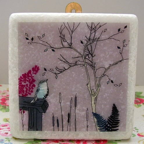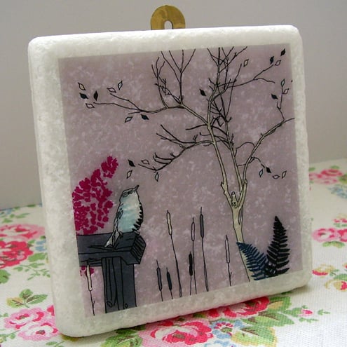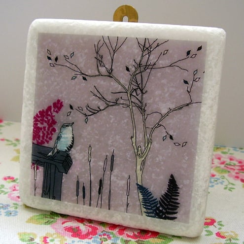 white marble tile featuring an original 'littlebirdy' design to hang on your wall!