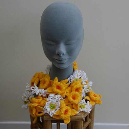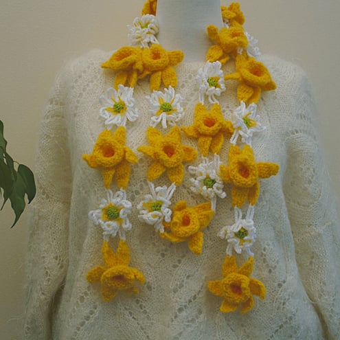 The daffodil petals are crocheted from a merino -blend yarn which is also used for the hand-knitted trumpets. The centre of each daffodil is finished with stitched stamens in an orange yarn. The daffodils (14 in total) alternate with white crocheted anemones ( 13 in total). The centre of each anemone is finished with a lime green knitted bobble encircled with stitched stamens.