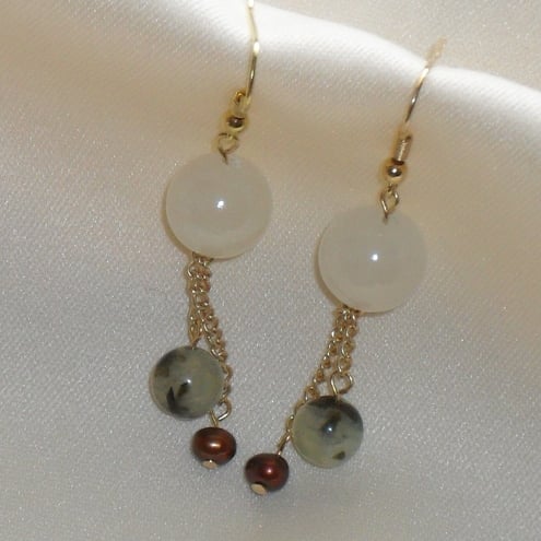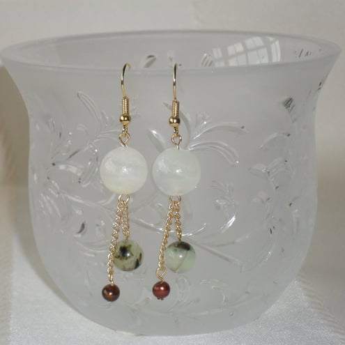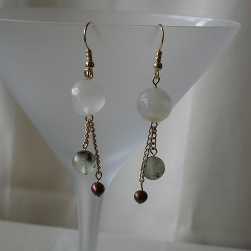 I made these earrings using three semi-precious gems - afganhistan jade, green prehnite and bronze freshwater pearls.