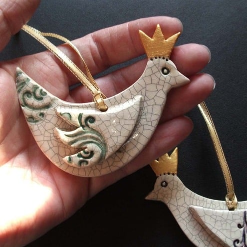 This set of two cute little birds with their golden Xmas hats on are made from white earthenware clay.