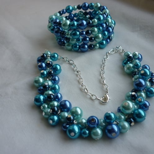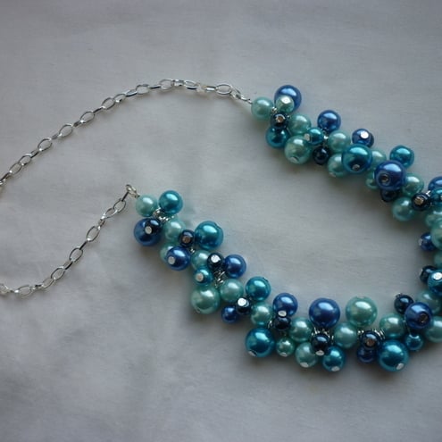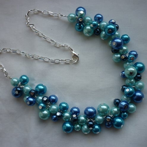 THE NECKALCE HAS BEEN MADE WITH GLASS PEARLS IN AQUA BLUE, TURQUOISE, ROYAL BLUE AND MONTANA BLUE IN SIZES 10MM, 8MM AND 6MM ALONG WITH SILVER PLATED HEADPINS AND SILVER PLATED TRACE CHAIN AND FINISHED WITH A SILVER PLATED LOBSTER CLASP.