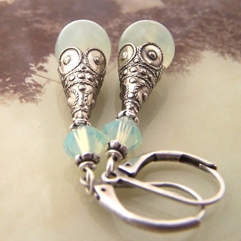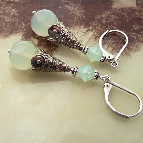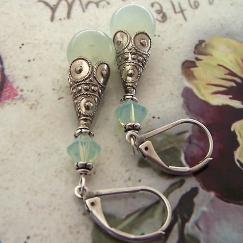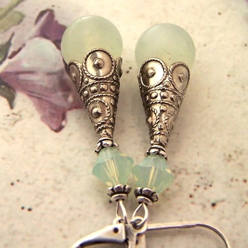 To make these earrings, I chose two beautiful 10mm round new jade stones, with a subtle, translucent-almost pearly-quality. I threaded these onto ball-headed pins, and finished them with long fancy antique silver bead cones. A pretty swarovski crystal in Chrysolite opal completes the earrings.