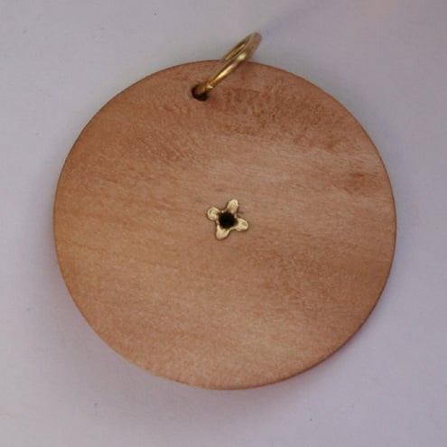 The brass has been riveted onto a large wooden bead and then for extra security glued, then lacquered, both bead and chick.