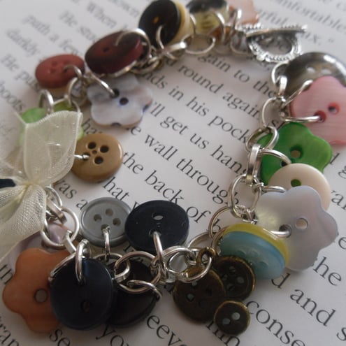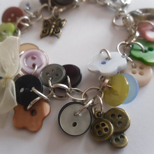 This lovely flower shell button multicolored bracelet attached all on a silver chain with a easy toggle fastener retro & new buttons.with a cute little lemon bow.