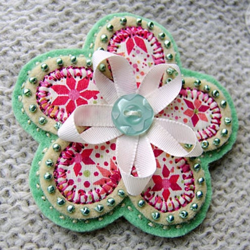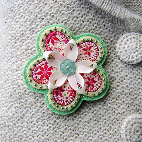 This is a beautiful handmade flower brooch. It features a lovely Liberty print fabric appliqued onto a pale gold felt which has then been backed with a mint coloured felt. It is finished with a beautiful beaded edging and a ribbon and button detail in the centre.