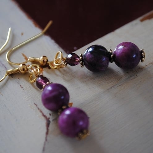 Purple Jasper earrings with crystals and antique gold daisy spacers. The jasper beads in these earrings are simply stunning.