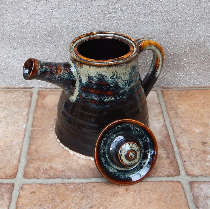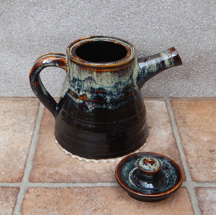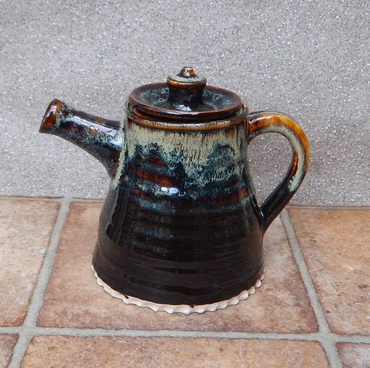 I threw this tea pot on my pottery wheel using strong white stoneware clay and finished it in a lovely combination of dark chocolate brown and runny ivory cream reactive glazes.