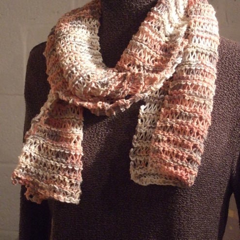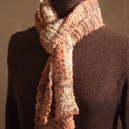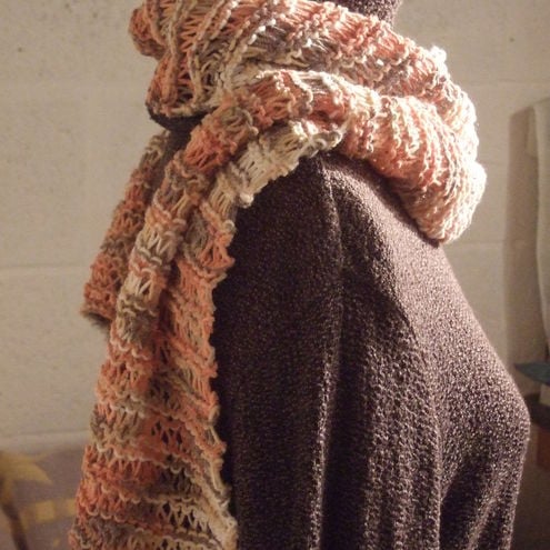 I enjoyed knitting this gorgeous, delicately coloured ladies scarf which is hand knit in dropped garter stitch using a random yarn of coral, beige,cream and grey. This yarn is one of the softest that I have used and was a real pleasure to knit, it will compliment so many colours and look great worn with black, browns,or blues.