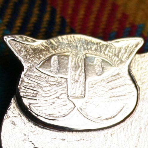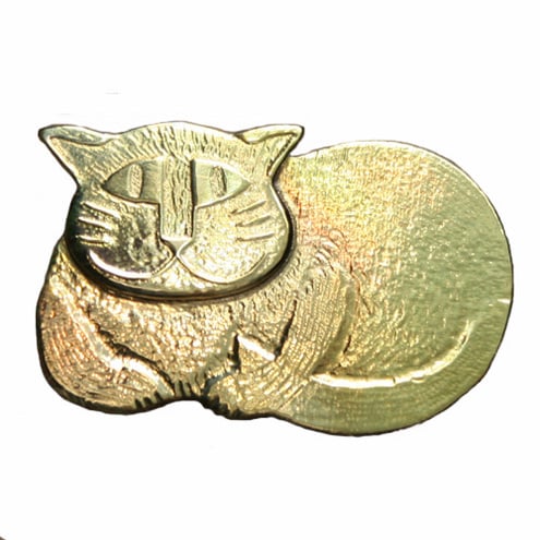 Handmade cheshire cat brooch, carved and etched out of brass.