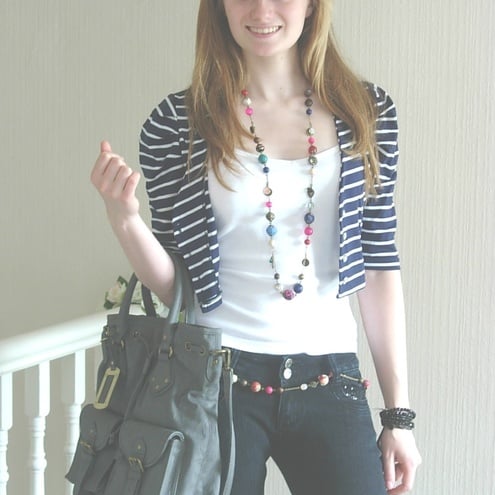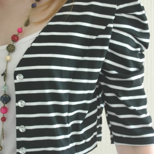 This little cropped jacket has been stitched using Striped T-Shirt Jersey fabric, available in Navy/White stripes. It has a cropped length and 3/4 length sleeves.