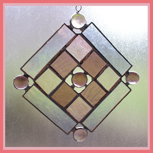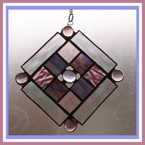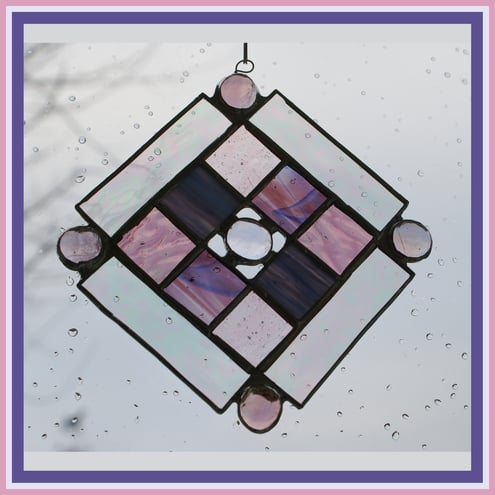 It is a new design based on squares within a square. In the centre and at each corner are matching coloured glass nuggets and the inner squares are framed with an iridescent clear border. I have used 4 toning colour and textures of glass, mauve and pinks for the 8 small, 1inch, internal squares.