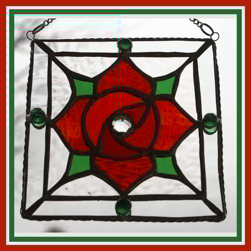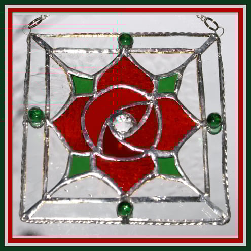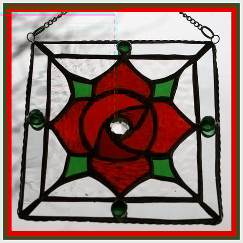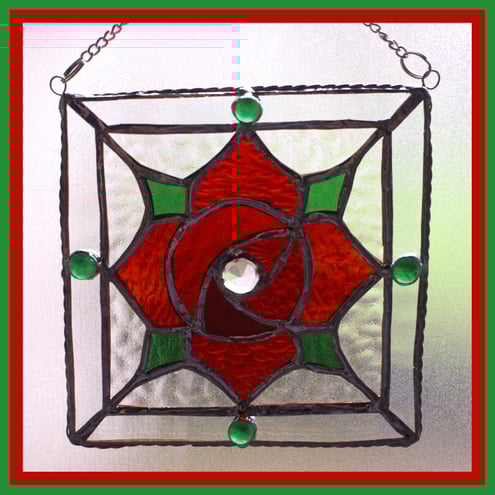 It is a simple, bright red Machintosh style rose made using several different shades and textures of red glass. The centre of the flower is a gorgeous multi-faceted clear crystal to catch the light.. The flower is in a surround of prettily textured clear glass and the square is in a square frame of more clear glass with a gently waving texture. I have affixed green jewels round the frame, back and front to adorn it.. The picture is then lightly framed with twisted wire which highlights the simplicity and brightness of the flower.