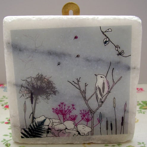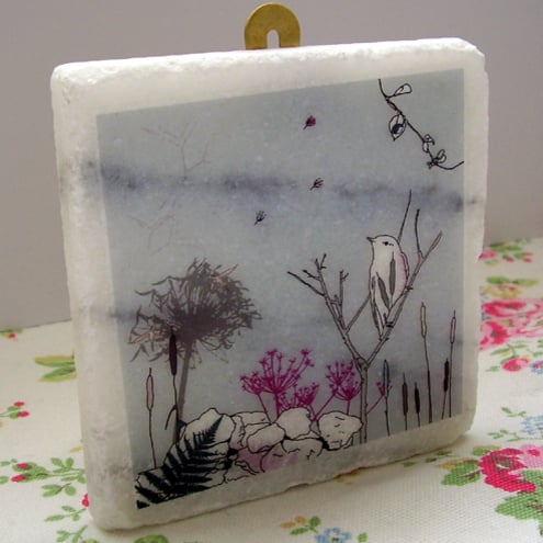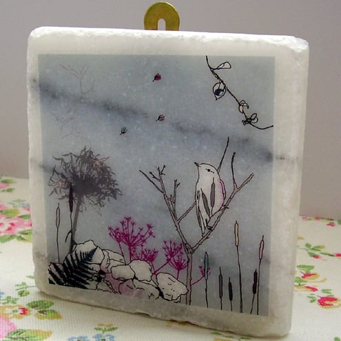 white marble tile featuring an original 'littlebirdy' design to hang on your wall!