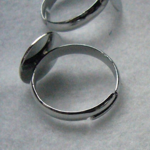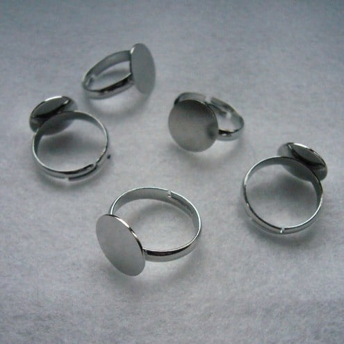 The nickel plated ring size is small but adjustable (photo 3) The pad ( the bit to stick to ) is 12mm and this listing is for 5 Rings.