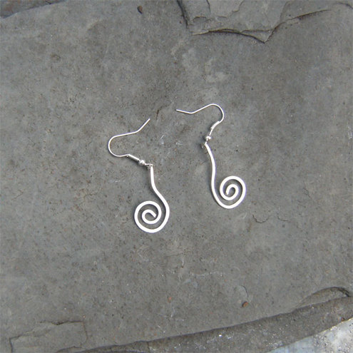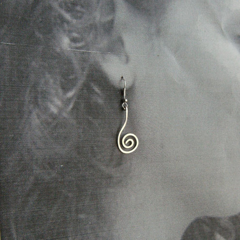 Sterling silver wire hammered into a flattened swirl shape and suspended from sterling Shepherd's Hook ear wires. These swirl shapes make me think of water or a spiral galaxy. Its certainly an evocative shape.