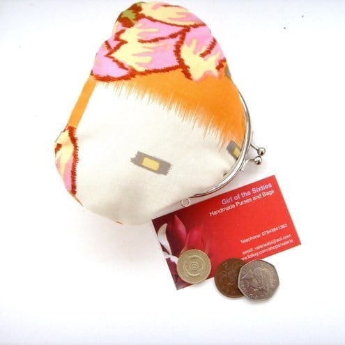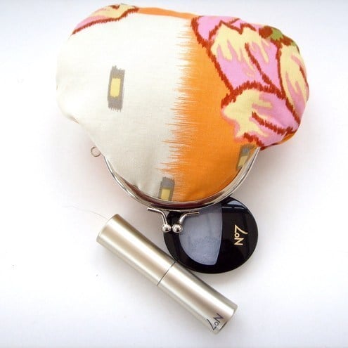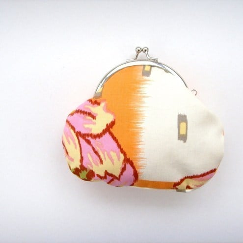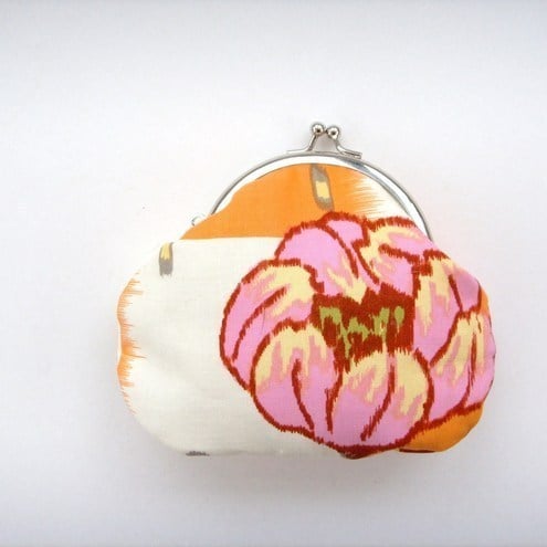Perfect little purse for your keys, change and credit cards or mobile phone.Pretty Amy Butler digital print fabric with contrasting lining, padding and metal frame clasp.