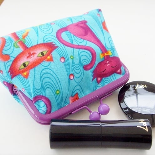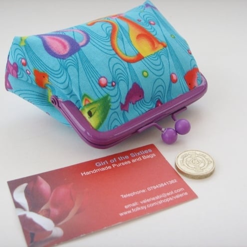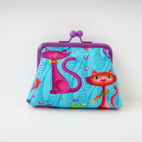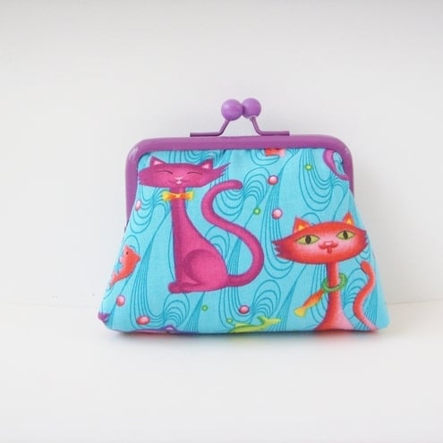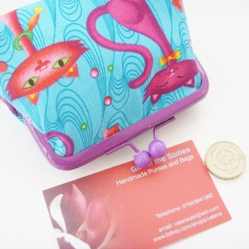 Perfect little purse for your keys, change and credit cards. Pretty Kitty fabric with contrasting lining, padding and purple frame clasp.