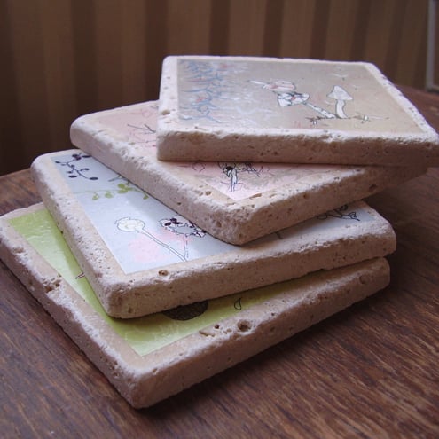 The designs are printed onto a special decal paper which i have careully applied onto a travertine tile. Each tile is varnished so can be safely wiped clean (even with flash-i have tested!) without harming the design. Each tile also has felt feet making them scratch resistant.